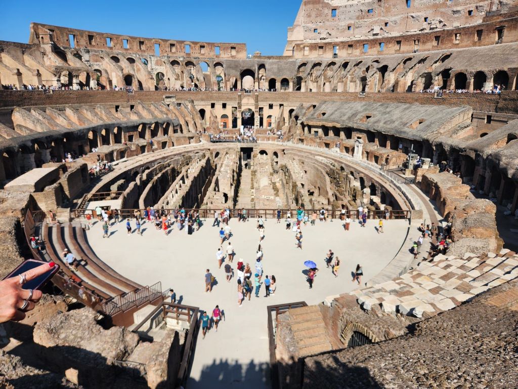 We left the hotel, into the messy cobblestone streets that were already baking in the sun. We arrived at the Colosseum in time for our 930 guided tour. Most places we go we don’t take guided tours, choosing rather to wander around when we want at our own speed, but last time we were in Rome we went on the guided tour of the Colosseum and it was totally worth it. I actually think you can only go into the Colosseum with a tour but I’m not a hundred percent sure. Maybe you can just go in alone. Anyways, taking an English speaking tour in a different country doesn’t mean you’ll be able to understand the English tour guide. You may in fact only catch a few words here and there that make sense. We started our tour outside the arena and worked our way from the arena floor to the second tier. For those who’ve read the Mark of the Lion books by Francine Rivers, it certainly brings those books to life. Knowing Christians like us died there for Jesus is again, so humbling, and brings a solemn feeling as you stand where they did, looking up to where the crowds waited for them to die.