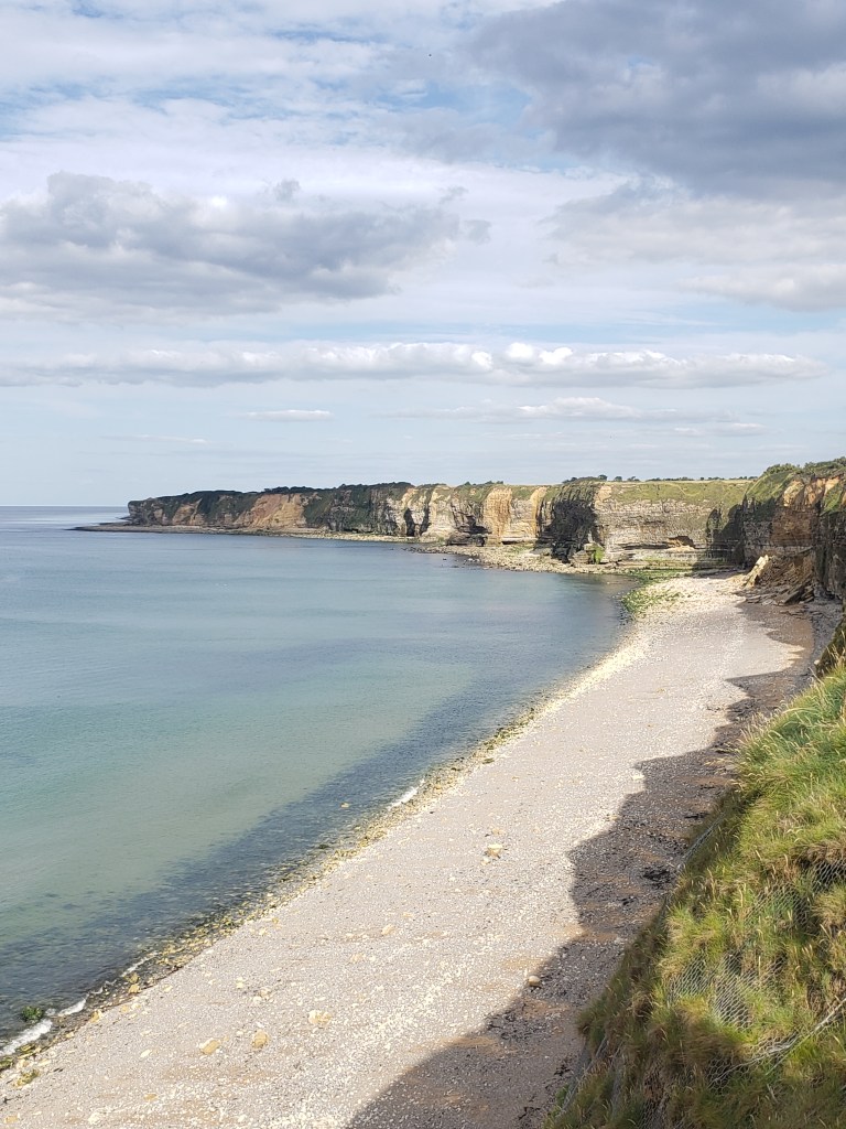 The first stop was in a decent sized town called Caen. You can easily find it on a map. We went to a big WW2 museum called Memorial de Caen and spent several hours watching films and reading and going through artifacts. I never cease to be amazed at the senseless loss of life all for the love of power. I left the museum feeling a little blue at humanity. We drove our sweet van over to Omaha Beach after the museum and spent some time walking on the sand at low tide, looking for seashells and remembering the past. The countryside is beautiful here on the coast. Overgrown bushes all over and vintagey brick houses that come right to the road. Small curving one-lane roads wind through the little villages that are full of French country charm that people at home pay HomeGoods for to get the look. Against the old brick houses grow holly hocks and hydrangeas in abundance. Roses spring over gates that hang ajar and jersey cows graze when we reach countryside again. It is idyllic. After the beach exploring, Morgan, Madison, and I drove over to Point du Hoc, a 5 minute drive from the Omaha Beach memorial. Point du Hoc are where the US Rangers took the cliffs and German bunkers step by step in the bloodiest battle of D-Day. We walked out on a gravel path. The sight is preserved simply with a waist high fence around it and small signs. The area we walked along the top of the cliffs was littered with huge craters from the fighting. We explored the bunkers that are left sitting quiet and empty, the rusted barbed wire still strewn along as a last effort of defense, and the cliffs with chunks missing for hundreds of yards. When you look out at the beautiful English channel, its hard to imagine such a lovely place once so full of sadness.