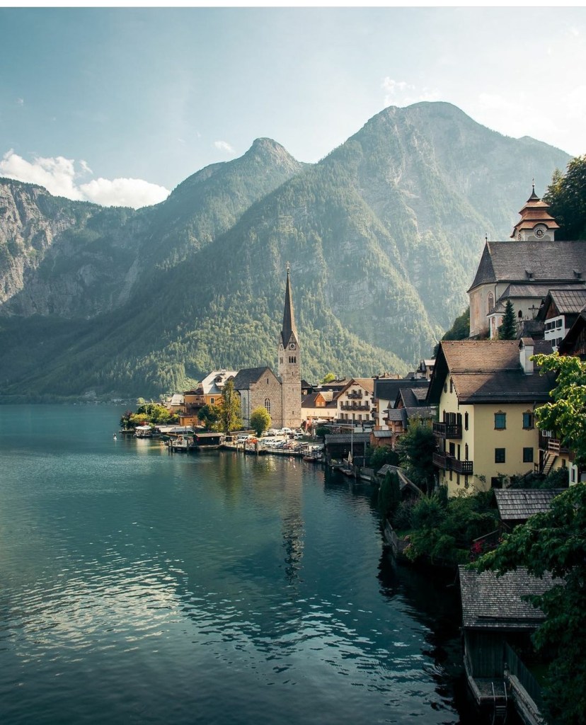 Wednesday- This morning all of our clothes were dry which is cause for celebration! We left Wels and stopped for pecan croissants and lattes at a place with a red velvet couch and two ladies running the bakery that reminded us of Mom and Rhoda. Then we drove 1.5 hours to Hallstatt, over rivers and mountains and through lots of tunnels. There are lots of pine trees and today there was sunshine. We got into Halstatt midmorning and walked the town. Most of the houses are made of wood with shutters and window boxes with geraniums in them. The houses go up and up the mountain all joined together but with little alleys running all over underneath them. The lake is a lovely blue green color and there are swan boats and actual swans cruising around on it and we decided to get a little boat so we could too. It was such a fun time going around the lake and relaxing on the boat and soaking up the sun. I know I sound like a broken record but it is absolutely gorgeous here and we are loving it 100%. Its doubly cool for Morgan because he had planned this cool anniversary trip for us here to Austria a couple years ago and covid canceled it so we are excited to finally be here! After touring around Hallstatt and getting coffee to go, we started driving towards our Airbnb an hour away. Morgan took a scenic route to Lake Gosau, this alpine lake beneath the Dachstein glacier. We hiked out to some rocks, past cows with actual bells on! and swam out into clear blue water where we were for a while. Then our trip continued on to Golling an der Salzach where we went to some downstairs burger place for supper and then went to our place which is a hotel tonight.