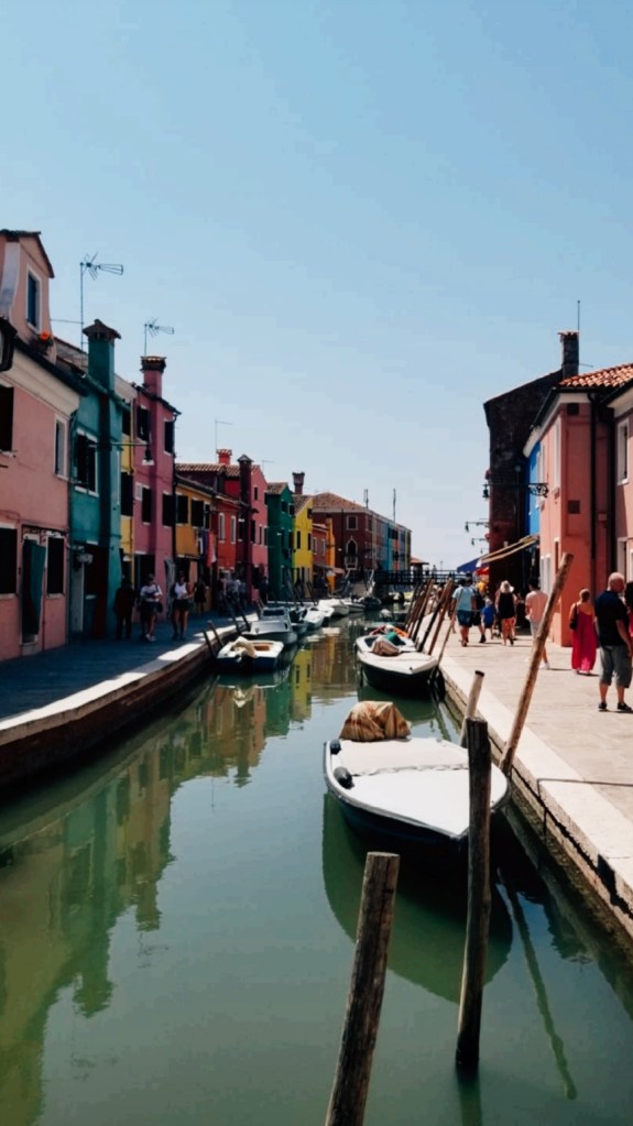 Monday morning we cruised out into the little cobblestone streets and found a place with muffins and lattes for breakfast. The city of Venice does not wake up early so it was fairly quiet in the streets. I wrote out some things to mail to my students:) and then we bought tickets to take the boat out to Burano. Burano is one of many little islands north of Venice and it took about an hour in a very warm ferry to get there. It’s a little fishing town with stone streets and lovely colorful houses lining the canals. They are also known for their lace making and there are lots of shops selling lace tablecloths and scarves. We had seafood pasta for lunch and walked through some of the town, then took the ferry back to Venice. We cooled off for a couple hours at the house. Our apartment is on the ground floor and you step directly out of a cobblestone alley through a big wrought iron door and into the hall. We went for a pizza and pasta supper and of course got gelato later.